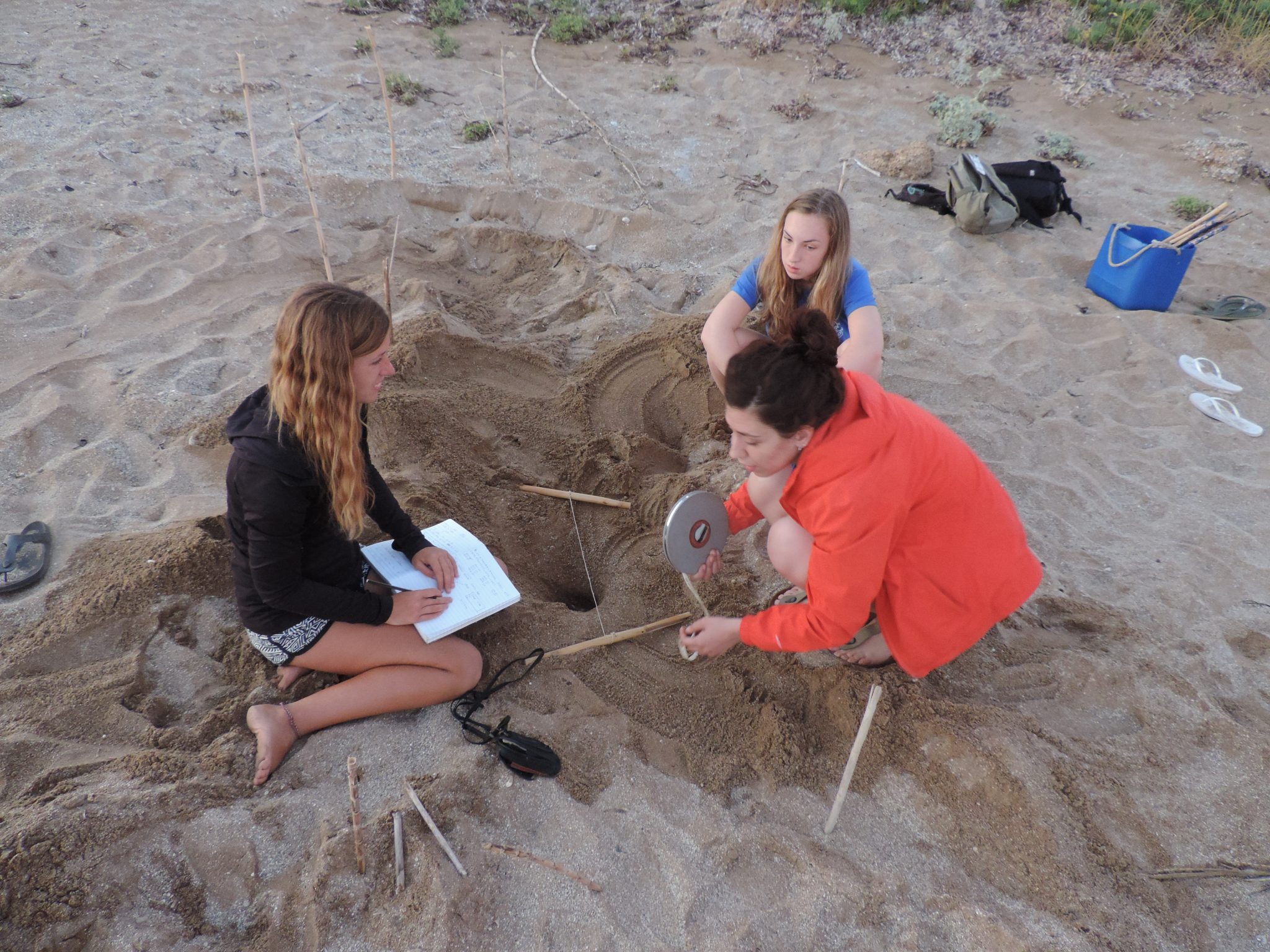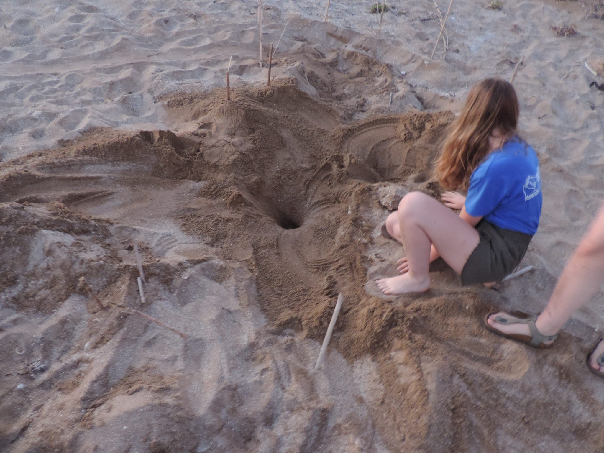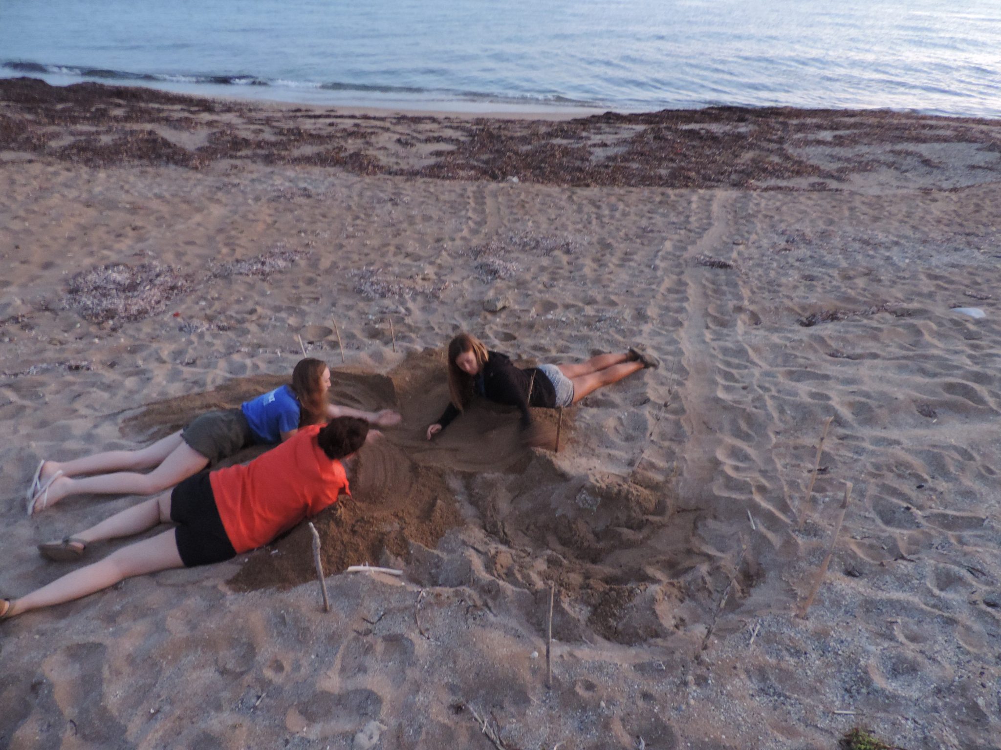 When Eve said so, we crawled up and noted that she had laid and was now covering the nest. We began taking measurements. Eve carried out the straight line Carapace measurements, I recorded them. Then I took the curved carapace measurements and Emma recorded them. We also recorded the time she finished covering, the completion of camouflage, the leaving of the nest and the first immersion in the water when her head is submerged either by a wave or swimming.