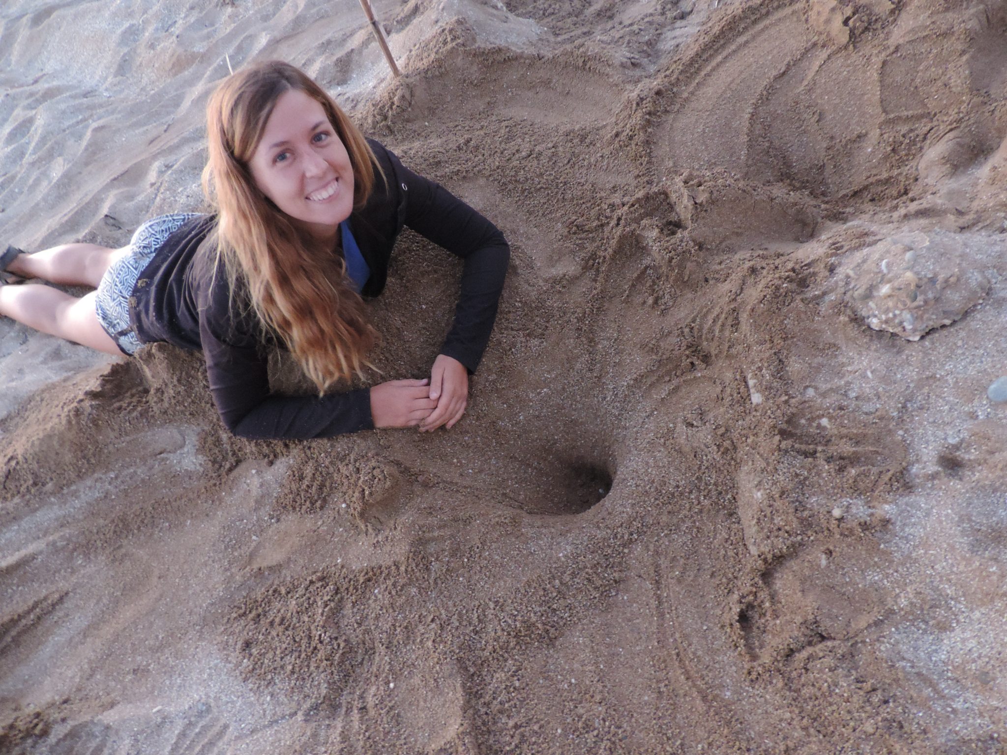We found more tracks and two body pits in front of a hotels wooden deck walk way. Although we didn’t think it was a nest – Eve can tell by the pattern of movements, we had to dig it to be sure. Everywhere the sand was really hard. We dug for an hour before deciding that there was no nest, including taking up the decking. Shortly after this the crew from the next sector joined us. They had completed their sector as there was no activity and so had probably saved us another hour of walking by cutting back to meet us.