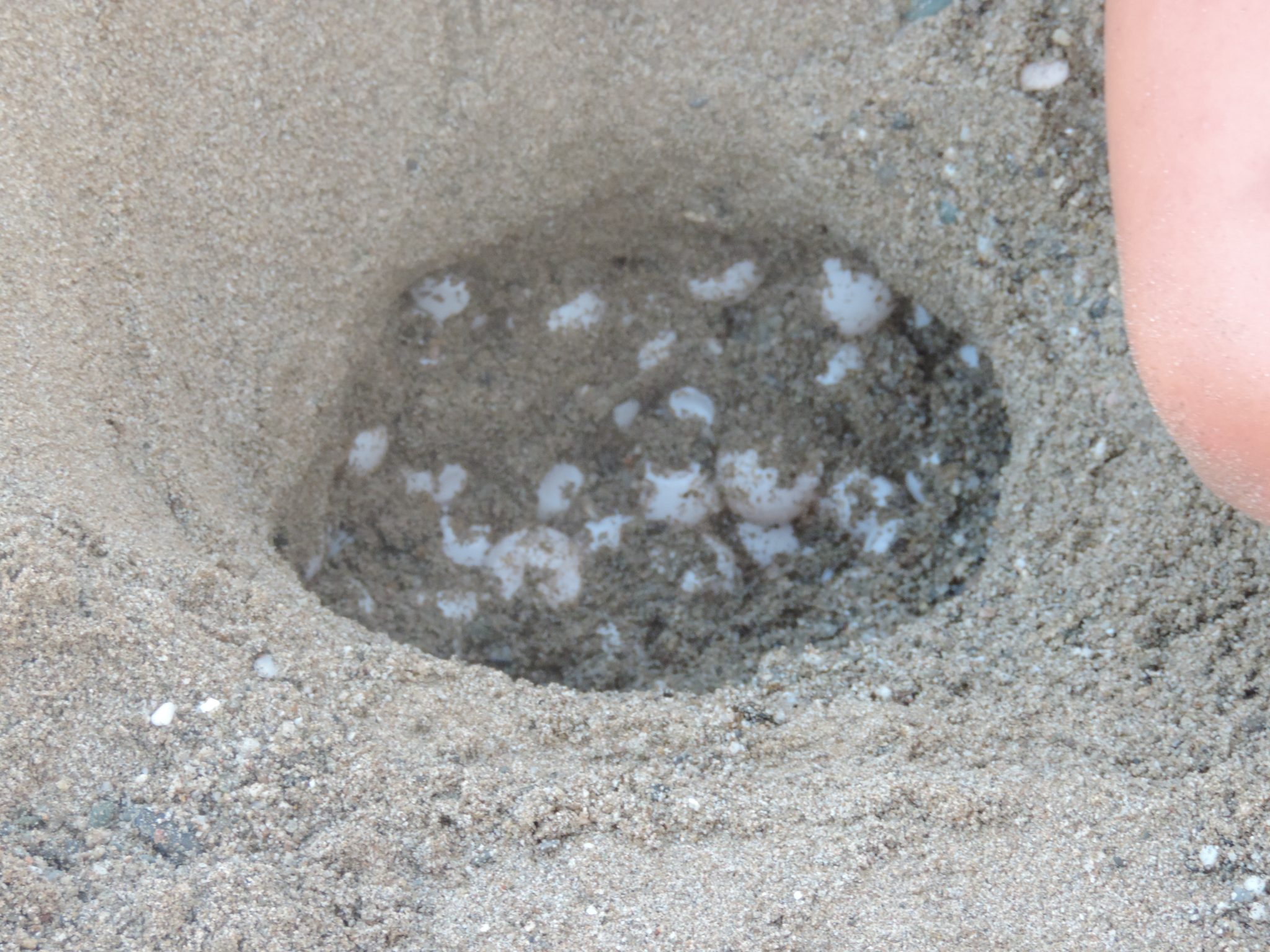 We found two more nests on the survey, following digging to find the nest both had to be relocated due to the proximity to the high tide line. The embryos and later hatchlings in the eggs breath through the shell and soft sand. While the sand has to remain moist, wet sand mans the young will suffocate in the nest.